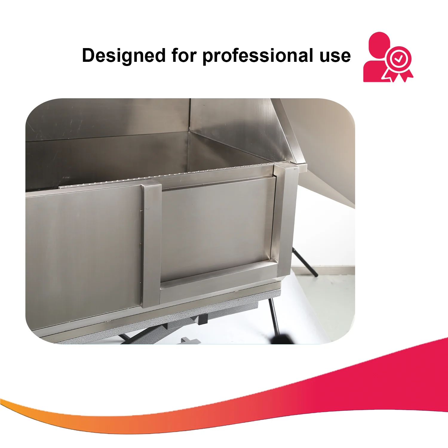 Dog Bathtub is made of Premium Grade 304 stainless steel, heavy duty tub designed for professional use, will not be rusted for at least 10 years under normal usage condition. It has Pre-drilling holes on each side panel allowing for 4" to 8" faucet hook-ups. The backsplash features U shaped hooks for shower heads to hang up to. The Backsplash and side panels can fold down for easy transport. This tub features an easy-to-use sliding door design. With Hydraulic grooming tubs, large breeds or older dogs can stroll in and out when the tub is lowered. Water resistant foot pedal controls make operating the tub simple. The gentle movement up/down does not startle pets. The dog bathtub comes complete with a non-slip plastic grid to keep pets above dirty water.