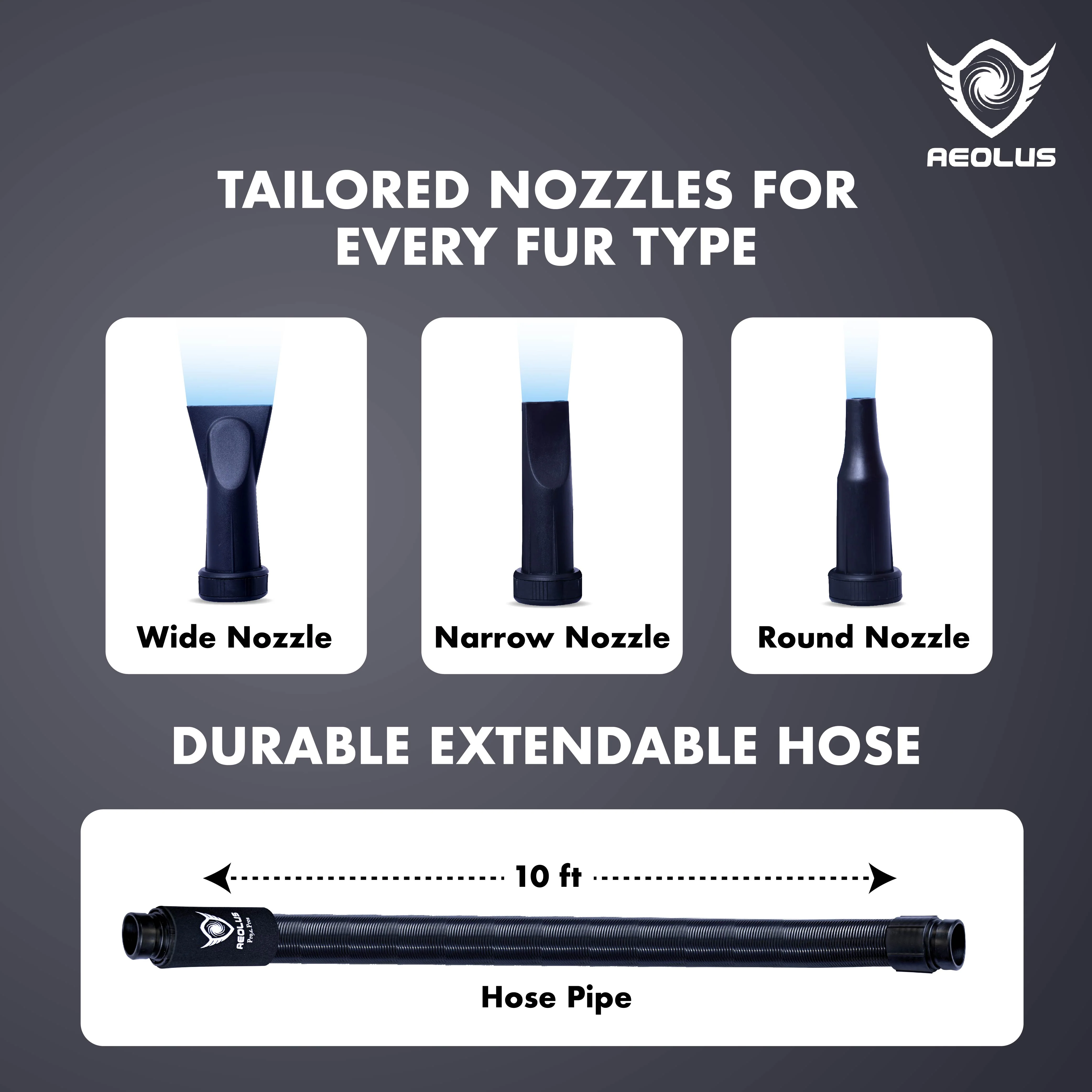 Constructed from durable steel, the dryer operates at a noise level of 85 dB, maintaining comfort for both groomers and pets. Additional features include a 10 ft hose, 3 nozzle attachments, and a lightweight design of 6.4 kg for ease of use. Built to last, the Hercules is the ultimate grooming tool for professionals seeking power, efficiency, and reliability.