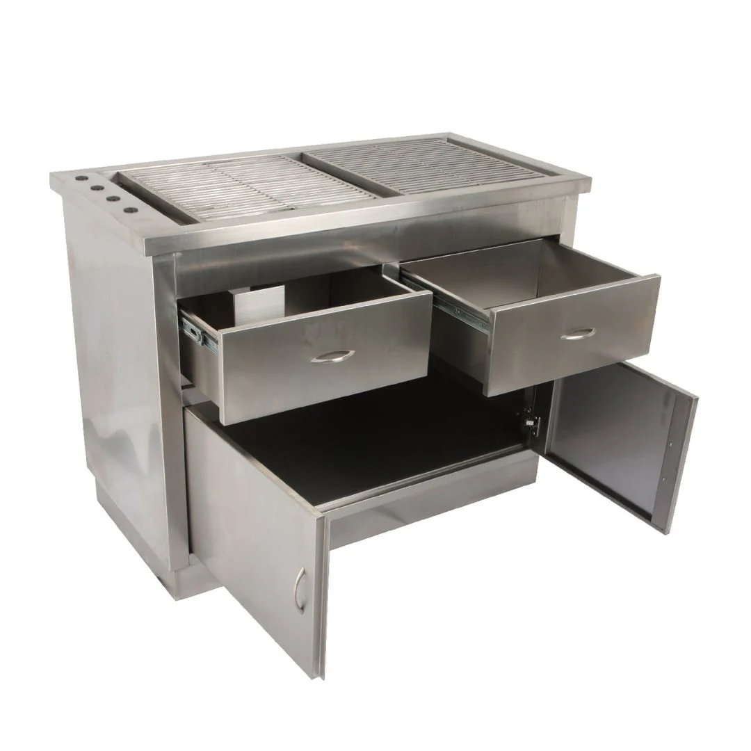 The tabletop is available in stainless steel or artificial stone, and the cabinetry is constructed from stainless steel or painted wooden board for durability.